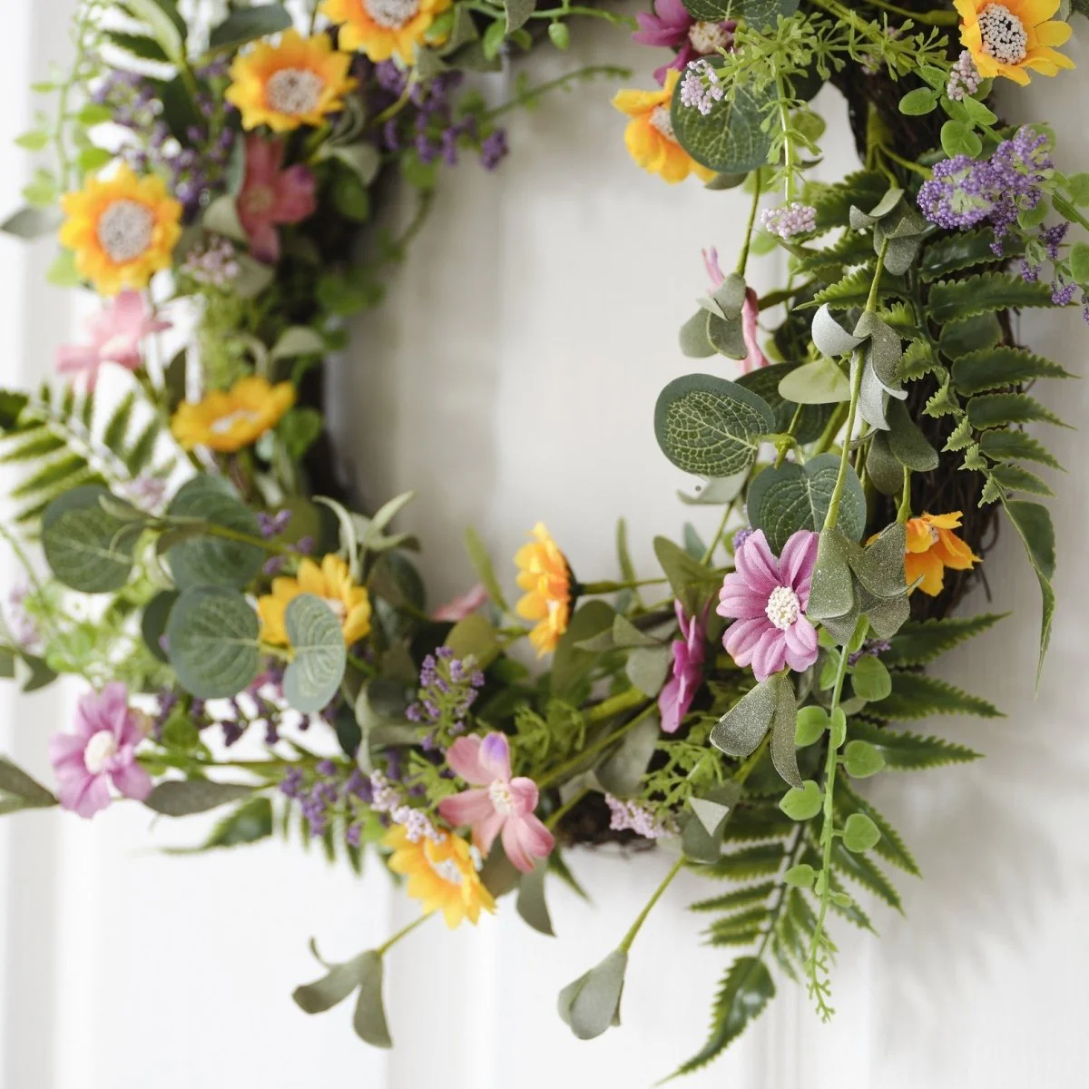 Deze decoratieve lentekrans heeft kleine gele en roze madeliefjes, lavendel en een mooi vleugje varen, klimop en saliegroene bladeren.